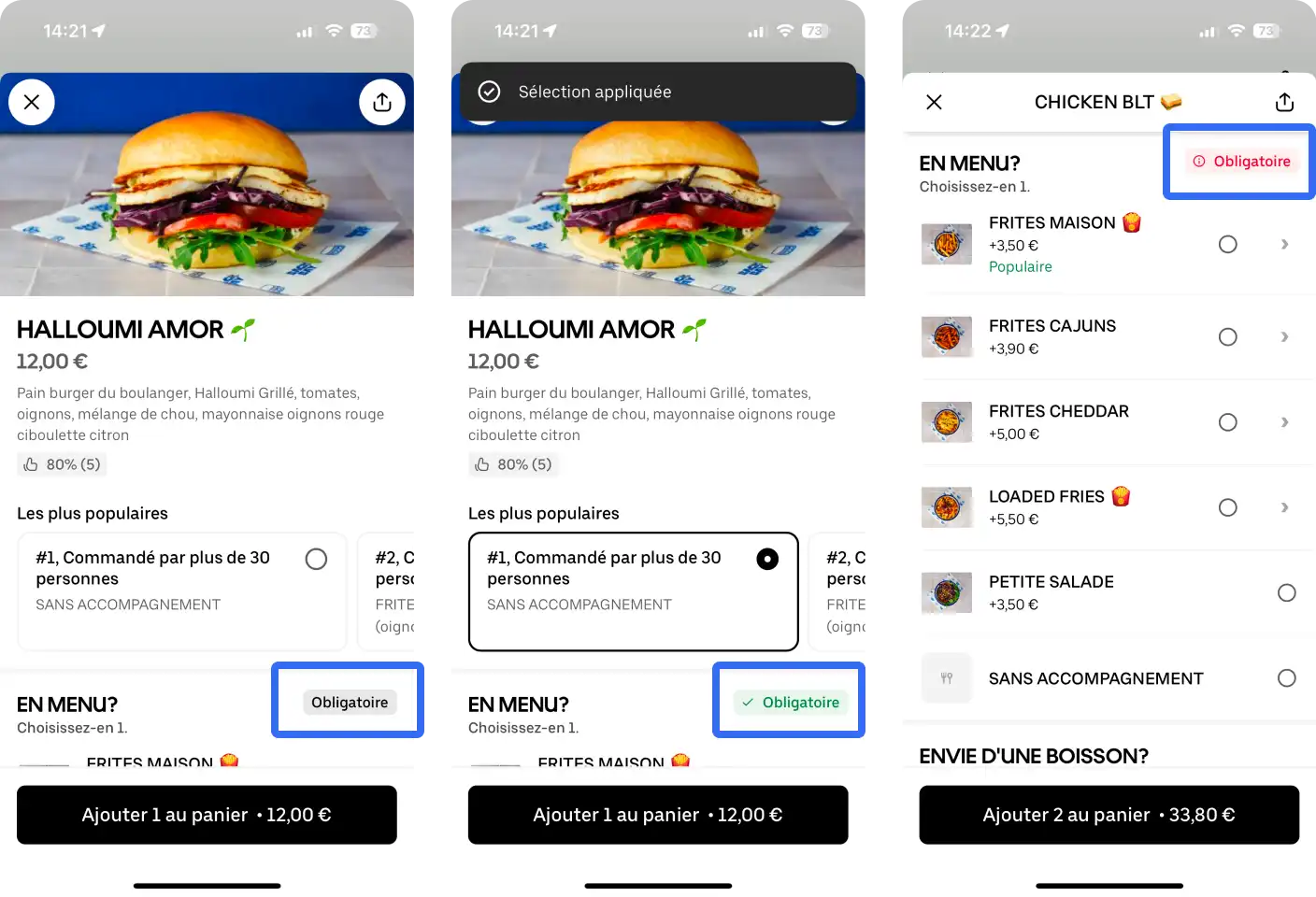 Tous utilisent des tags "obligatoire" avec un état visuel fort via un jeu de couleur. Uber Eats par exemple va proposer un tag gris “Obligatoire” pour les sections où les articles n’ont pas encore été renseignés. Ce tag passe au vert, une fois la sélection effectuée, ou au rouge si elle a été oubliée.