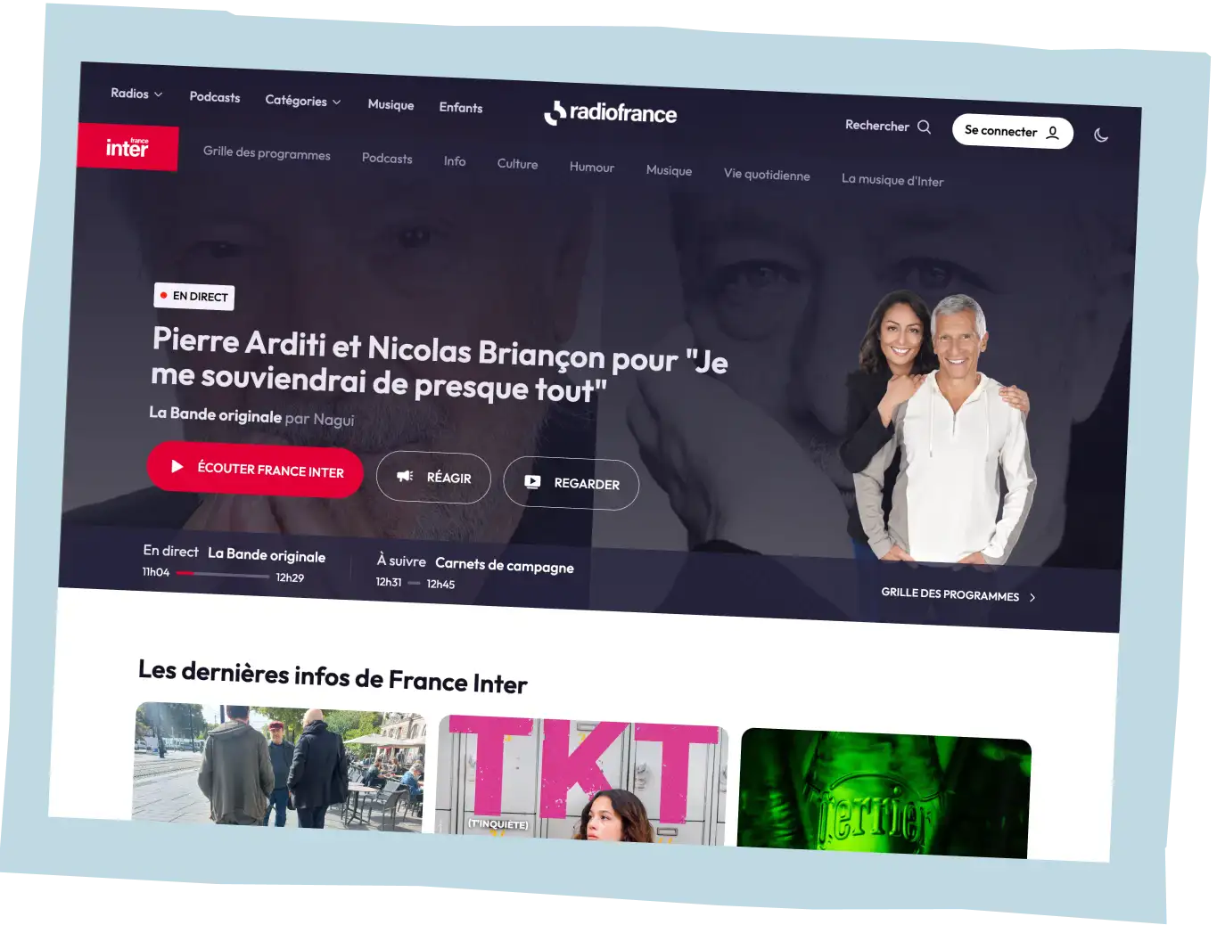 Radio France, acteur incontournable du service public, souhaitait moderniser son écosystème digital. L’objectif : réunir les sites de 7 radios aux identités fortes en une plateforme unique, tout en préservant la richesse et la singularité de chacune.