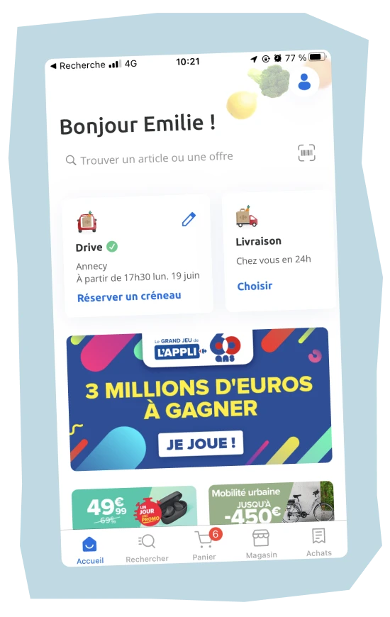 En partenariat avec Publicis Sapiens, Maemi Studio a pris en charge la refonte UX/UI du design de l'application mobile Carrefour, optimisant l'expérience utilisateur sur une durée de 6 mois.